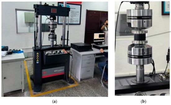 This rubber buffer static test loading device utilizes a maximum test force of 100 kN and is compatible with the MTS Landmark fatigue testing machine model, as shown in Figure 2a,b. Experimental environment testing equipment using temperature and humidity meter model HTC-1.Experimental measuring equipment includes digital calipers with an accuracy of 0.01 mm. The vertical stiffness of the rubber buffers was tested in accordance with the experimental specification “General Requirements for Static Strength Tests of Aircraft Structures HB 7713-2002” []. Vertical compress pressure is applied gradually in three stages, with an unloading interval of 30 min between each application. This process ensures that the rubber buffer fully rebounds before the next loading. All three loading rates were set at 8 mm/min. The limiting load was the maximum load for normal use of the buffer, while the preload was 45% of the limiting load, and the limiting load was defined as 150% of the limiting load.