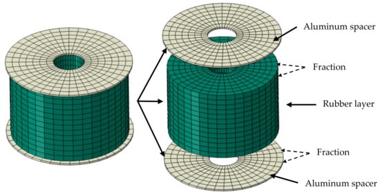 The specimens in this paper are hollow cylinders machined from nitrile rubber. The outer diameter of the specimen is 95 mm, the inner diameter is 25 mm, and the height is 63 mm. The hardness of the rubber is 70.5. The aluminum spacer has a thickness of 1.5 mm, an outer diameter of 102 mm, and an inner diameter of 25 mm. The construction of the specimen is illustrated in Figure 1.