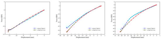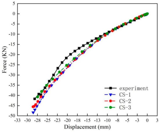 The known rubber hardness can be converted to the modulus of elasticity using Formula (6). Subsequently, this can be calculated by Formula (5), provided that the ratio of the relevant parameters , is determined []. In practical applications, measuring rubber hardness is relatively straightforward, making it easier to obtain the material parameters using this method. Three sets of data are selected and input into ABAQUS, where Equation (5) is employed to calculate three different sets of values, as shown in the accompanying Table 1. According to the simulation results depicted in the Figure 4, it is evident that the material parameters for CS-2 are closest to the experimental values; therefore, this parameter is selected.