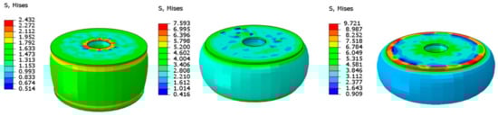 The ABAQUS FE simulation of the preloading experiment, limiting load experiment, and ultimate load experiment was conducted, resulting in the load–displacement curve presented in Figure 5. The stress distribution and deformation of the rubber buffer under various vertical pressures are illustrated in Figure 6.