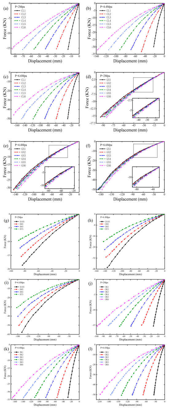 FE model load–displacement curve: (a) P1 = 2 Mpa, (b) P2 = 4.4 Mpa, (c) P3 = 6.6 Mpa, (d) P1 = 2 Mpa, (e) P2 = 4.4 Mpa, (f) P3 = 6.6 Mpa, (g) P1 = 2 Mpa, (h) P2 = 4.4 Mpa, (i) P3 = 6.6 Mpa, (j) P1 = 2 Mpa, (k) P2 = 4.4 Mpa, (l) P3 = 6.6 Mpa.