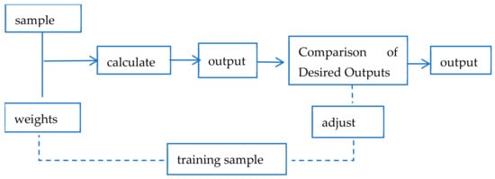 BP neural networks are the most commonly used multilayer perceptron networks that employ error backpropagation among the various types of artificial neural networks []. The structure consists of one input layer, several hidden layers, and one output layer. The layers are connected by weights, and there are no connections between layers of the same type []. The core steps of the BP neural network model are shown in Figure 8. For the input training samples, the hidden layer is obtained by forward propagation and propagated to the output layer after the activation function is computed. If the result produced by the output layer is unsatisfactory, then it is necessary to backpropagate, adjust the weights, and retrace the original path. The error is minimized through continuous iteration, resulting in satisfactory outcomes.