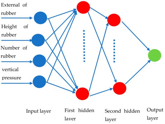 The reasonableness of the number of hidden layers in a neural network is related to the accuracy of its predictions. The empirical formula was used to determine the range of the number of neurons in the single hidden layer, which was 5–13. Then, the trial and error method was used to determine the optimal number of neurons in the single hidden layer, which was five and four, respectively []. The incorporation of additional hidden layers in deeper neural networks heightens the risk of overfitting. In scenarios where the dataset is limited in size, shallower networks, such as those with a single hidden layer, may be insufficient to adequately capture the intricate nonlinear relationships that exist between input parameters and their corresponding outputs. The BP neural network model structure consists of an input layer, two hidden layers, and an output layer. The input layer is composed of diameter , rubber thickness , vertical pressure , and the number of rubber layers , and the output layer is composed of vertical stiffness . A schematic representation of the neural network model is presented in Figure 9.