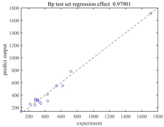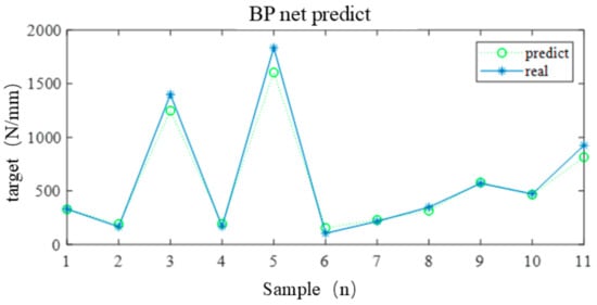The model stops fitting when the number of iterations is about 10, and the best results are obtained at the fourth iteration of training. The BP neural network model, trained using the sample data, demonstrates the capability to compute the vertical stiffness of the rubber buffer. To validate the trained BP neural network model, it is essential to evaluate the model using a test set; specifically, the remaining 11 data points are used to test the BP neural network model. The test results are shown in the Figure 10.