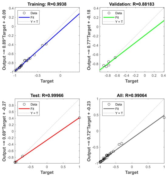 It can be seen from Figure 11 that the target value is the training accuracy, and the best value is the highest accuracy that can be achieved during the training process across the training set, validation set, and test set. The horizontal coordinate value in the training process represents the number of iterations, and the vertical coordinate represents the mean squared error. It can be seen that the best value after training exceeds the target value and meets the requirements. From Figure 12, it can be seen that the training set, validation set, test set, and total dataset are fitted after training. The correlation coefficient R between the prediction results and the finite element results is close to 1, which indicates that the error between the output values and the finite element results is very small.