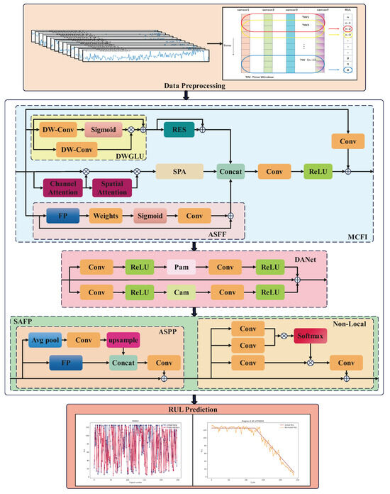 The overall design of the proposed method, as illustrated in Figure 1, integrates an MCFIB, which extracts three key features: essential information from the original data using a depthwise separable convolution-enhanced residual block, structured and regularized information from an attention-based SPA block, and multiscale information from an ASFF block to achieve a broader receptive field. These integrated features are then processed through an improved dual-attention module, which refines critical information and expands the receptive field across both spatial and channel domains, ensuring more effective feature representation. Additionally, the SAFP module enhances input details and strengthens the model’s stability through a pyramid-based pooling mechanism, which aggregates multiscale contextual information to maintain robustness in diverse RUL prediction scenarios. The self-attention mechanism within SAFP establishes long-term dependencies, allowing the model to effectively track progressive degradation patterns over extended time periods. The following subsections provide a detailed overview of the individual components. To manage the computational complexity, our model includes one MCFIB module, one dual-attention layer, and one SAFP module. The specific details are provided in Table 1, where N denotes the number of samples, and L denotes the sequence length of the sliding time window.