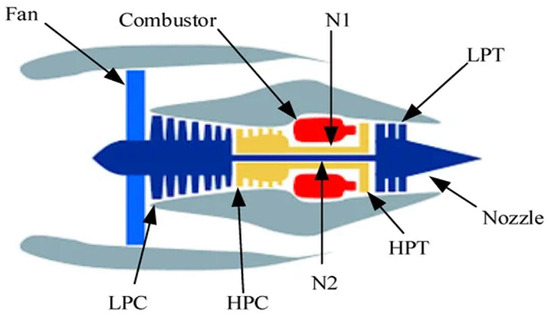 In this study, the C-MAPSS dataset, a benchmark turbofan engine dataset developed by NASA, is used to validate the efficacy of the proposed approach [34]. This dataset simulates real turbofan engine deterioration, providing a realistic testbed for RUL prediction. A diagram of the simulated turbofan engine is shown in Figure 3.