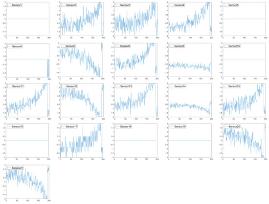 Initially, the sensor selection is guided by prior research, focusing on relevant features that exhibit clear degradation patterns leading up to failure [35]. Figure 4 presents the sensor values from the FD001 subset, where a visual analysis reveals that some sensors remain stable throughout the degradation phase, making them less informative for RUL prediction. As a result, S1, S5, S6, S10, S16, S18, and S19 were excluded, while the remaining 14 sensors were retained as model inputs. Table 3 provides the detailed specifications for the selected sensors.