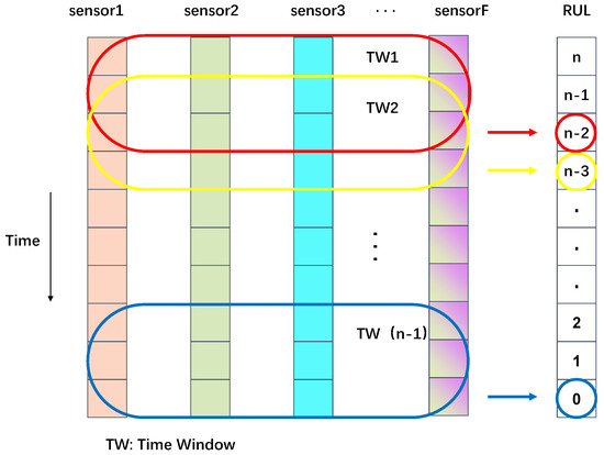 Understanding the relationships between neighboring time intervals is crucial in time-series analysis. The sliding window approach captures these dependencies by segmenting data into fixed time windows, where each time point’s input corresponds to an RUL value. The stride of the sliding window is set at one, maximizing the number of samples for training. Figure 5 illustrates this process. The window size must be shorter than the minimum life cycle, ensuring effective data representation. Through experimentation, a window length of 25 steps was chosen for the optimal performance.