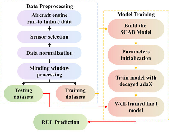 Figure 6 presents the flowchart of the proposed architecture, structured into three main phases: data preparation, model construction, and RUL prediction. The model construction and RUL prediction phases incorporate procedures similar to those of data preparation, including sensor selection and data normalization. In the model construction phase, the SCAB model is developed and trained using the training dataset. Once trained, the model is applied to the testing datasets to perform RUL prediction, ensuring an accurate estimation of the remaining useful life.