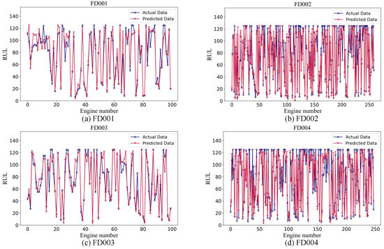 To comprehensively validate the RUL estimation capability of the proposed method, Figure 7 illustrates a comparison between the predicted and actual RULs across the FD001, FD002, FD003, and FD004 sub-datasets.