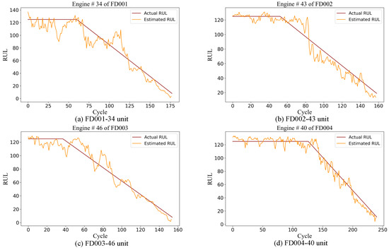 To enhance the clarity and interpretability of the prediction results, the observed values were compared with the predicted ones. By randomly selecting specific engines from each sub-dataset and juxtaposing the actual RUL with the predicted RUL for each cycle, the model’s predictive accuracy is clearly demonstrated. As shown in Figure 8, predictions for randomly selected engines from the four different subsets are displayed. The orange curve represents the predicted RUL values, while the red curve denotes the actual RUL values. Specifically, Figure 8a presents the prediction results for engine unit 34 from the FD001 test set, Figure 8b shows the results for engine unit 43 from the FD002 test set, Figure 8c illustrates the results for engine unit 46 from the FD003 test set, and Figure 8d depicts the degradation trajectory prediction for engine unit 40 from the FD004 test set.