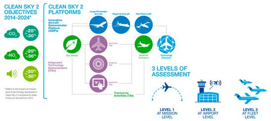 Figure 1 shows the general structure of the targets and the scope of activities of the Clean Sky 2 program including the tasks of the Technology Evaluator as a so-called “transversal activity”. The left side of the figure shows the environmental objectives of Clean Sky 2. These objectives refer to the mission-level impact of new technologies developed in an integrated concept aircraft compared to its reference state-of-the-art 2014 technology counterpart. For CO2 and NOx emissions, the reduction objective was set within a band of from 20% to 30%. The same holds for noise emissions.