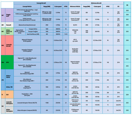 Overview of Clean Sky 2 concept aircraft and reference aircraft (#: number; dark blue: concept aircraft; light blue: corresponding reference aircraft; green: EIS of concept aircraft) [1,2].