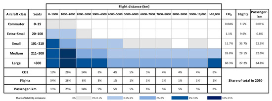 Distribution of CO2 emissions in relation to aircraft size and flight distance in 2050 as a market opportunity for the People Mover (aircraft class: large, flight distance: 0–4000 km) [10,11].
