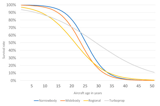 Survival probabilities of aircraft in relation to aircraft category and age [3].