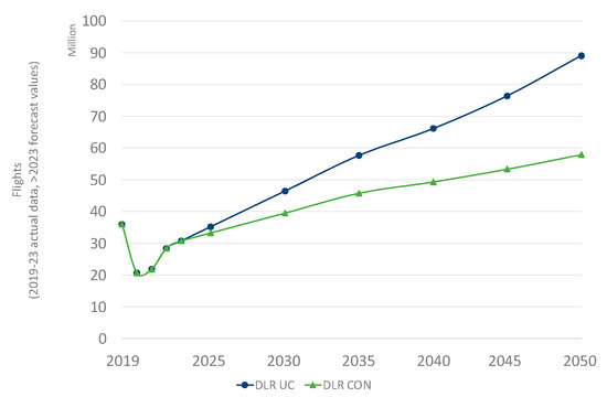Figure 5 and Figure 6 show that the DLR model is appropriate compared to established forecasts by verifying the results for the unconstrained forecast scenario. Especially the comparison of the aircraft delivery forecasts, which asserts a high degree of conformity on the DLR model with the other forecasts because the aircraft deliveries are typically at the very end of a forecast, and the passenger and fleet forecast, as well as numerous inputs and assumptions, have to fit to make this happen. While we do not know each detailed assumption and input of these established forecasts, the results suggest a high degree of conformity. The DLR CON forecast adds limited airport capacity, which shifts the results in a consistent manner.
