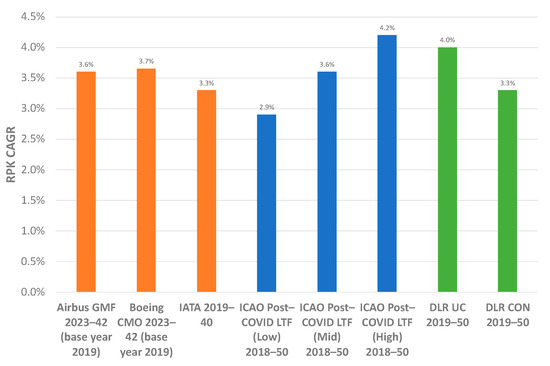 The various sub-models of the DLR model have been assessed theoretically in terms of statistical measures, like R2, etc., in [13]. To further verify the results of the DLR model from a more practical and holistic perspective, a comparison with established forecasts has been carried out. Figure 6 displays the revenue passenger kilometers (RPKs) and compound annual growth rates (CAGRs) of the established forecasts of Airbus [16], Boeing [17], ICAO [18] and IATA [19], as well as the DLR UC (unconstrained) and DLR CON (constrained) forecasts [3]. The DLR UC is comparable to the established forecasts, as it does not consider future airport capacity constraints. This forecast fits well with the other forecasts in terms of future RPK growth. However, exact assumptions and inputs of the established forecasts are difficult to obtain for a more detailed analysis. However, as the DLR UC forecast is quite close, it suggests that the forecast assumptions, e.g., GDP, population and airfare development, are rather similar. The DLR UC helps to put the DLR CON into perspective and verifies it. The difference between those two forecasts is a result of future limited airport capacity, which affects the future development of passenger, flight and RPK volume, as well as the fleet structure.