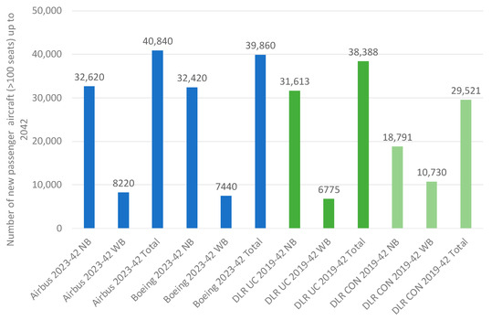 Figure 7 displays the aircraft delivery forecasts of Airbus [16], Boeing [17] and DLR for aircraft of over 100 seats up to 2042 [3]. The aircraft delivery forecasts illustrate the total number of aircraft (Total), as well as the split into narrowbody (NB) and widebody (WB) aircraft. The DLR UC forecast is very close to the aircraft delivery forecasts of Airbus and Boeing, both in terms of the total number of aircraft deliveries as well as the widebody/narrowbody split. The DLR CON forecast is shifted more towards fewer aircraft being delivered, and the split shifts more towards widebody aircraft because of limited airport capacity: passengers are carried by larger aircraft, i.e., more passengers per flight, and the passenger number, RPK and flight volume are lower compared to the DLR UC forecast. As a result, fewer aircraft are needed, and the aircraft tend to be larger.