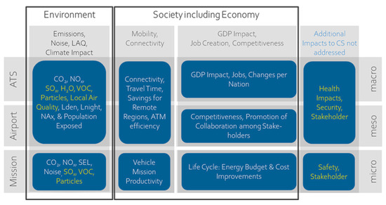 Figure 8 shows the overall framework and metrics of the Technology Evaluator assessments. A first overall assessment was performed in 2021 [11,20], followed by a second assessment in 2024 [1,2]. Figure 7 shows the assessment levels and associated topics. The assessment levels (mission, airport and ATS) are shown on the left. The vertical columns show the topics and associated metrics. Environmental impacts as well as socio-economic impacts have been evaluated, i.e., mobility, connectivity and macro-economic relating to aircraft fleet development. The metrics in yellow were not addressed in the Technology Evaluator during Clean Sky 2 and are possible candidates for further assessments in future projects.