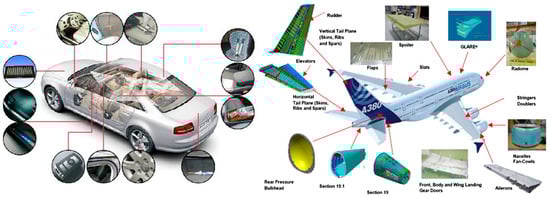 Applications of adhesive joints in aeronautics [2] and automotive vehicles (https://www.buehnen.de/en/applications/automotive accessed on 10 March 2025).