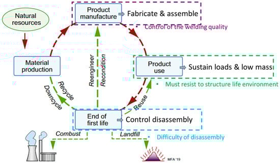Our study is focused on fabrication, verification of load sustainability, and demonstration of disassembly control, which are three of the four main steps in the life cycle of a product, as presented in Figure 3.