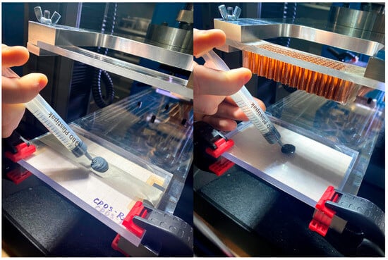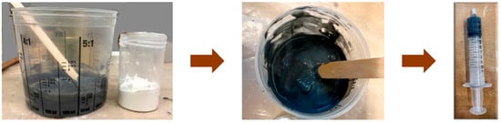 The EC2216 liquid epoxy adhesive and the desired amount of TEP volume are mixed by hand in a cleaned and neutral mixing container. The quantity of each ingredient depends on the final volume of adhesive that is desired and on the chosen volume proportion. For example, 10,000 volumes of adhesive for 15 volumes of TEPS written 10,000:15 in the paper. Then the mixture is poured into a surgical syringe for deposition and spreading analysis (Figure 4). Volume indications on the Figure 4 are not representative of the mixture proportions nor quantities. The syringe is inclined during filling to prevent air entrapment. The level of adhesive is measured to make sure the deposited volume in the final joint is 5 mL for the compression and spreading tests. A series of 3 to 5 samples was fabricated for each configuration of test.