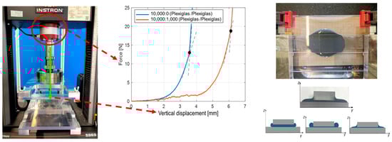 The resistance force plotted on ordinate axis of Figure 6 is registered using a 10 kN force cell mounted on the mobile crossbar of the INSTRON 5969 device from Instron France S.A.S. Elancourt France, Élancourt, France (Red circle on Figure 6 show the location of the cell force). Two 100 µm-thick aluminum shims are placed at the extremities of the bottom plexiglass plate to set the final thickness of the joint. When the upper plate touches the shims, the force suddenly increases and represents the aluminum compression resistance. The maximum force of adhesive joint setting is measured at the slope change on the force–displacement curve. The displacement is measured from the initial position of the upper plate above the adhesive joint just after the adhesive deposition to limit the adhesive flow due to gravity. The maximum displacement is different from one experiment to another, depending on the height of the adhesive when the upper plexiglass plate touches the adhesive, creating zero force. Since the volume is controlled to always be 5 mL, the height evolves differently depending on the ability of the adhesive to flow with gravity without adding any compression force. The maximum force and maximum displacement are determined by the abscissa and ordinate of the intersection point where there is a sudden slope change due to contact with the shims (big black dots on Figure 6).