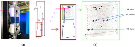 (a) Tension tests’ experimental setup and dimensions of the tensile samples in mm, and (b) typical distribution of TEPs and bubbles in the samples.