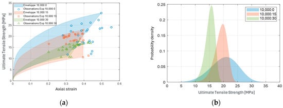 The ultimate tensile strength for each percentage of TEPs is reported as a function of axial strain in Figure 8a, and the envelope helps with obtaining the probability density of the Weibull distribution, as shown in Figure 8b.