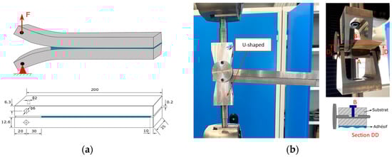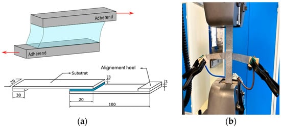 As for the DCB configurations, tests with no TEPs and no metallic mesh were performed to determine the ultimate strength of the “bare” specimens. The geometry of the specimens used can be seen in Figure 12a, and the experimental setup is shown in Figure 12b. The two substrates, as well as the two alignment blocks, were made from carbon fiber composite and epoxy resin, using woven composite plates available in the laboratory from other applications, with their stacking configuration confidential.