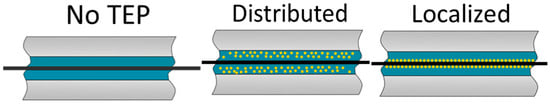 The adhesive was tested in various configurations: with the adhesive alone, with a high mass percentage of TEPs, with TEPs sprinkled on the metal fabric, and with metal fabric alone. Situations of TEPs and TEP cluster distribution are illustrated in Figure 10. The different TEP cluster distributions were obtained through uniform mixing for the “distributed” situation or no mixing for the “localized” one.