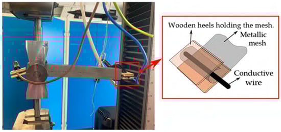 Samples are fabricated following the protocol described in the previous paragraph. When used, the metallic trigger is placed over the adhesive before closing the specimen with the second substrate covering it. The metallic mesh is connected at each extremity to a current generator. The full system is illustrated in Figure 11.