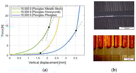 Impregnation test results are illustrated in Figure 13. In the absence of TEPs, the metallic mesh slightly increases the resistance to compression by about 10% compared to the flat plate. The low viscosity helps the liquid adhesive to flow easily in the honeycomb cells, decreasing a lot of the resistance of the axial compression force compared to the flat Plexiglas plate. The final shape of the menisci in the cells illustrates the capillary effect also shown in Figure 6. For the honeycomb case, the maximum displacement is reduced by a factor of two compared to the fat plate. This is because the lateral flow of the adhesive is highly limited by the honeycomb cells. Since the air present in the cells is freely pushed away by the adhesive, the adhesive is not compressed but guided to slide along the NOMEX cell walls.