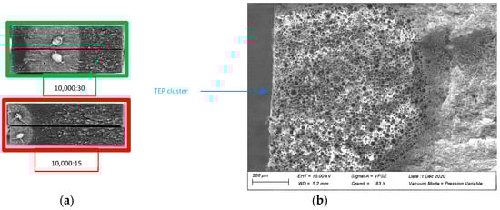To better understand the regularization effect of the TEPs, the fracture surface was analyzed. Typical fracture patterns are illustrated in Figure 14. It was found that crack initiation and propagation always occur within TEP clusters. Clusters of TEPs are the white ellipsoids in Figure 14a. TEPs in a TEP cluster are visible as black spheres in Figure 14b.
