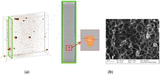 Clusters are also visible in Figure 15. The negligible amount of adhesive in the cluster regions is shown in Figure 15. To understand crack initiation and propagation in the presence of clusters, three types of analysis were performed: volume reconstruction from X-ray data (a), analysis of 2D X-ray images ((a) center), and imaging using SEM ((b), realized by CNES). The crack path is clearly visible between particles strongly trapped in the adhesive and their neighbors in the cluster. The shape of the cluster creates a concentration of stress that initiates the crack.