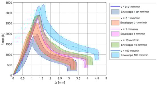 No change in the fracture surface pattern nor in the slope of the force–displacement curve was observed (see Figure 16). For that reason, the maximal velocity of 10 mm/min was kept for the rest of the tests. The tests were performed at an observed ambient room temperature of 24 °C ± 0.2. Variability of the mm/min speed is due to the 6 h-long duration of the tests that were partially performed at night. The velocity of 10 mm/min seems optimal because of both the low variability and the short duration of tests.