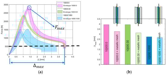 Influence of the addition of TEPs and metallic mesh on (a) maximum force and (b) maximum displacement: dark colors are without metallic mesh; light colors are with metallic mesh.
