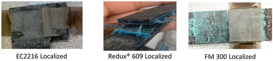 The SLJ-type specimens were used for the application and demonstration of the disassembly protocol controlled by the Joule effect for three different adhesives: 3M™ EC2216 Scotch-Weld™ Epoxy Adhesive, Saint Paul, MN, USA (liquid two-component same as previously described), Redux® 609 (film from Hexcel Composites SASU, Blagnac, France), and FM300 (film from Syensqo, Pessac, France). The main difference in the protocol is the application method of the adhesive. For EC2216, the paste adhesive was applied to the substrates using a spatula, as in all previous tests. For the others, patches of adhesive, cut to the size of the bonded area, were applied to the substrates. To be able to use the TEPs and the trigger, three strategies of TEP distribution were tested: no TEPs, TEPs distributed in the whole adhesive (EC2216 liquid only), and TEPs localized in a thin layer of adhesive around the trigger. This last configuration is called “localized”. Wood or silicone shims were fabricated to ensure the desired thicknesses and were placed so that it was possible to assemble all the layers and consider the thickness of the metallic mesh. After assembly, samples were placed in vacuum bags and cured in an oven to polymerize the adhesives. As for DCB samples, the EC2216 followed a cycle of polymerization at 66 °C for 140 min, while the cycle was at 120 °C for 60 min for the Redux®609 and 175 °C for 60 min for the FM®300.
