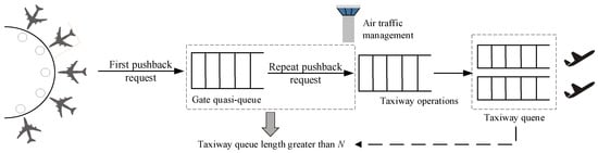 Meanwhile, due to the increased demand for flights, flight fuel consumption and emissions also face challenges [4]. Data indicate that carbon dioxide emissions from the aviation industry account for 12% of all transportation-related emissions and approximately 2.9% of the total global emissions [5,6]. However, hub airports with multiple runways and gates face significant operational uncertainties during ground operations, and inefficient resource allocation can extend the ground operation times and increase environmental gas emissions [7]. Thus, in the context of high-density airport operations, the development of a dynamic cooperative scheduling method that aligns with the characteristics of multi-runway airports is of significant theoretical and practical value for optimizing ground operations, enhancing flight punctuality and promoting green and sustainable development. To address this challenge, this paper proposed an innovative dynamic scheduling method for departing flights, with a primary focus on the coordinated optimization of the pushback and sequencing assignment processes. By aligning with the operational demands of airports and considering the dynamics and complexity of ground operations, we aimed to enhance the efficiency of multi-runway airports under mixed take-off and landing conditions. The method can be divided into two stages: the first stage extends the pushback control strategies across multiple runways to determine the optimal thresholds, reducing the taxiway waiting times and alleviating congestion; the second stage, which is the core of the method, is dedicated to the integration of flight sequencing and runway assignment, using a multi-objective optimization model to minimize flight delays and operational costs. By embedding a continuous-time Markov chain (CTMC) within the whale optimization algorithm to track flight state transitions, it ensures the coordinated optimization of both the pushback sequences and runway resource allocation. Additionally, the model accounts for runway occupancy by arriving flights, further improving the runway utilization and departure scheduling efficiency. Figure 1 illustrates the flight departure process incorporating pushback control.