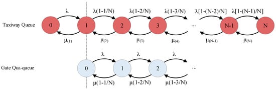 At the gate, flight arrivals follow a Poisson distribution, with an input probability of 1 since the airport cannot reject flight schedules. Consequently, the output rate matches the input rate of the taxiway. For the taxiway, flights enter the overall waiting queue with a probability (1 − n/N), or may be held at the gate with a probability [1 − (1 − n/N)], resulting in gate holding. The service rate μ(n) is based on the minimum safe distance between consecutive flights. In this study, the wake turbulence separation is adopted as the standard, ensuring that the service rate complies with requirement under multi-runway conditions.