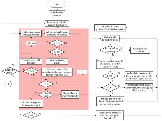 The whale optimization algorithm (WOA) is a swarm intelligence optimization technique inspired by the hunting behavior of humpback whales [29]. It utilizes strategies like encircling prey and spiral updating to explore multiple regions of the solution space, effectively preventing premature convergence and enhancing flexibility and robustness in complex airport environments. Building on this, we proposed integrating the improved CTMC-based algorithm within the WOA, allowing the algorithm to adjust flights in real-time based on current taxiway queue lengths. Specifically, CTMC interactions are embedded within each individual to assess fitness, and under this condition, the optimal solutions for flight sequencing and runway assignment are determined during the scheduling period, thereby adapting to changes in the airport ground conditions. The interaction framework and algorithm flow are illustrated in Figure 3.