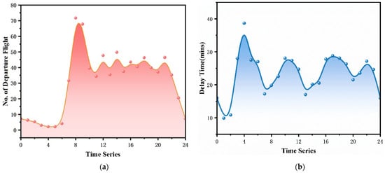 Analysis of the daily departure flight data: (a) hourly departure flight demand; (b) hourly average flight delay time.