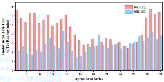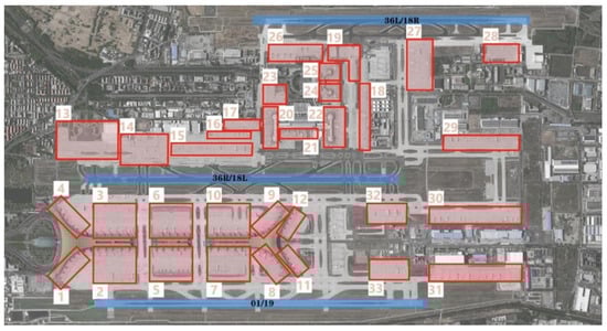 The airport’s runways, from west to east, were designated as 36L/18R, 36R/18L, and 01/19. For the case analysis, departure data from runways 36L/18R and 36R/18L on 1 November 2013, were used including pushback requests for 775 departing flights. Figure 4 shows the hourly departure demand and average flight delay time. Considering variations in taxi distances under different runway and gate combinations, the apron was divided into 33 zones based on the layout of gates and runways at PEK. The zones are shown in Figure 5. As shown in Figure 6, based on the zoning, the unobstructed taxi time from each zone to the south end of the runway was calculated to simplify the scenario optimization process.