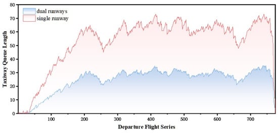 Simulations were conducted for both the pushback control and sequencing phases. This study overcame the previous limitation of treating the taxiway queue as a single-server system by implementing a multi-server queue model. Figure 7 shows the simplified results of the taxiway queue lengths for single- and dual-runway configurations without pushback control. Clearly, without considering the complexities of airport operations, a dual-runway setup is more effective than a single runway, significantly reducing the number of flights queued on the taxiway. However, comparing this to the departure demand in Figure 4a revealed that if the peak demand for departing flights persists without scheduling measures, taxiway queues will accumulate due to slow dissipation. This highlights the need to integrate a linear dynamic pushback control model for optimization.