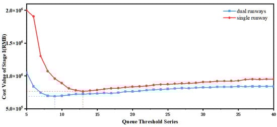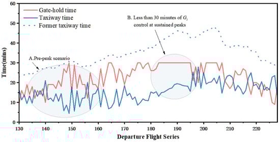 Figure 8 illustrates the cost variation during the pushback control phase as the taxiway queue threshold N changes, aimed at finding the optimal threshold for daily pushback demand. To enhance model adaptability, stage I does not distinguish by aircraft type, setting the service intensity as the average wake turbulence separation based on a mix of aircraft types. Values of N below 5 were omitted due to excessively high costs. The optimal solution for dual-runway scenarios occurred at N = 9, while for single-runway scenarios, it was at N = 13. The corresponding average taxiway queue time and gate-hold time are shown in Table 3. Clearly, the higher service intensity of dual runways accelerated the dissipation of taxiway queues, resulting in a lower optimal threshold N, indicating stricter pushback control. Under the optimal threshold, the time metrics for dual runways were more favorable. Additionally, because the gate-hold penalty in the objective function is an exponential term, once the queue threshold exceeds a certain limit, the cost curve shifts from being dominated by the taxiway queue time to being influenced by the gate-hold time. This value represents the point where the average taxiway queue time and gate-hold time are optimized.