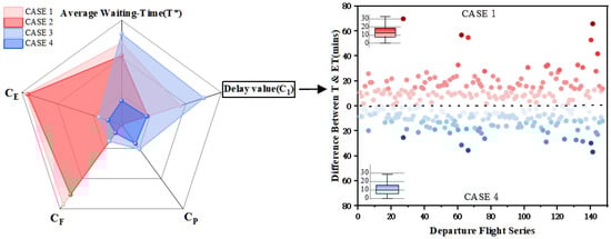 Table 4 outlines four scenarios under optimized flight sequencing: (1) no pushback control and no sequencing optimization, (2) no pushback control but with sequencing optimization, (3) pushback control without sequencing optimization, and (4) pushback control with sequencing optimization. It presents the average gate-hold time, average taxiway waiting time, delay deviation, and various cost values for each case. Here, T* represents the total sum of waiting times.