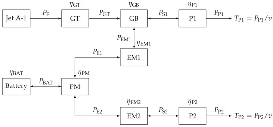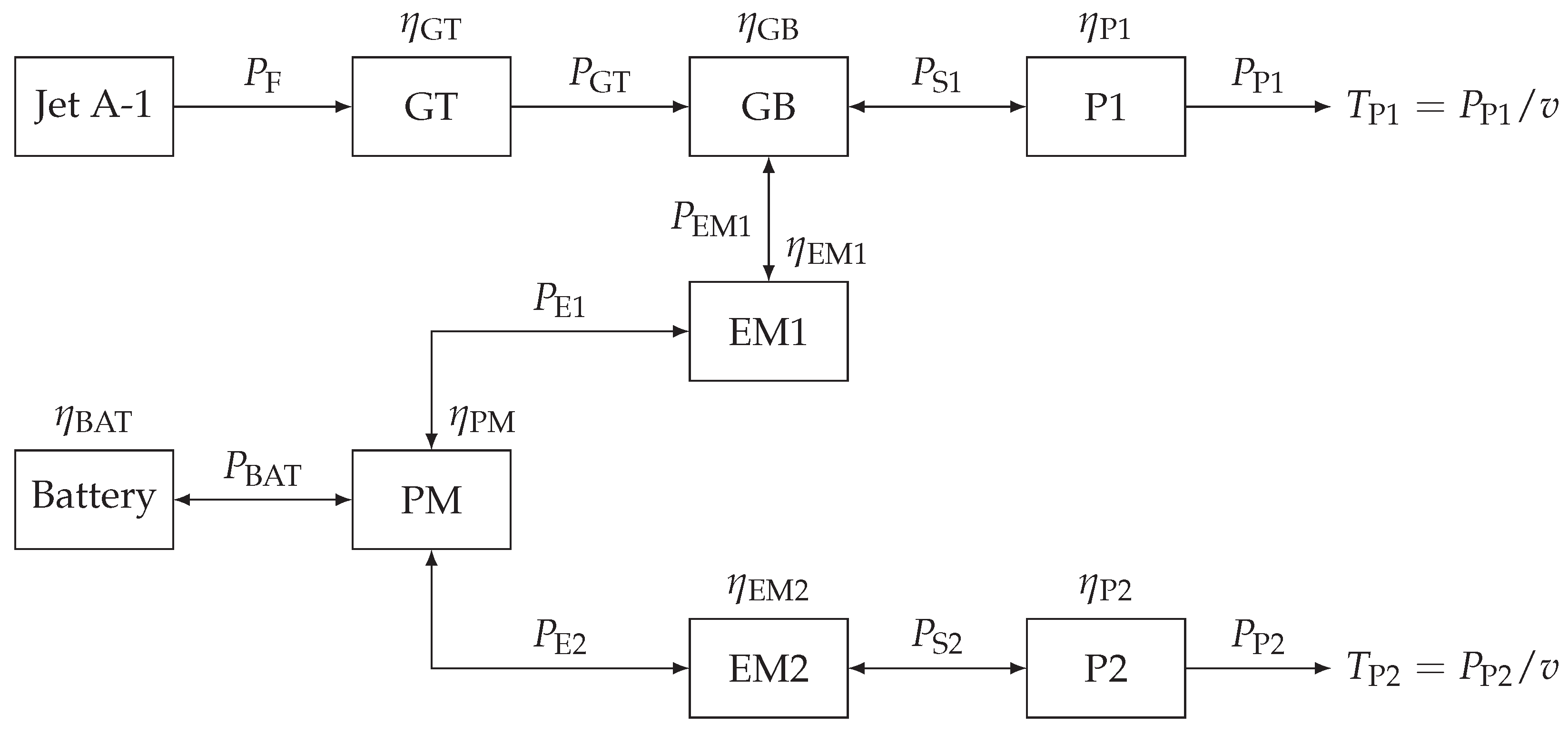 The SPPH architecture includes two energy carriers: Jet A-1 as the primary energy carrier and a battery as the secondary carrier. This configuration features two power paths. As illustrated in Figure 1, the primary power path consists of a gas turbine (GT) supplied with fuel power (defined as the product of the lower heating value and mass flow rate), followed by a gearbox (GB) and a primary propeller (P1). The secondary power path includes a battery (BAT) connected to a power management (PM) component, followed by a secondary electric motor (EM2) that receives the secondary electric power and a secondary propeller (P2). The PM component represents, in the first approximation, multiple power conversion and distribution units, such as a DC/DC converter or a DC/AC inverter. In this context, the PM is modeled as a component with an associated conversion efficiency. The two power paths are interconnected through the electric motor (EM1), which handles the corresponding primary electric power , enabling power exchange between the primary and secondary paths. The propellers convert shaft power into propulsive power , which is then transformed into thrust together with the flight velocity v.