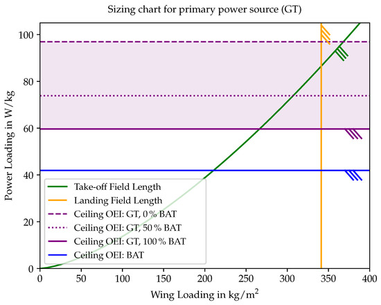 The normalized required power loading of propeller aircraft, , is a key parameter for assessing the constraint [21,26,48]. This metric is especially relevant for conventional propulsion architectures that employ propellers, taking into account different types of power sources , such as combustion engines. An example is provided in Equation (7), which shows the formulation for OEI scenarios (reflected in the oversizing factor ) considering the required vertical speed [21,26,48]: