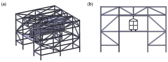 The model of the launching test system with the launch unit: (a) axonometric view; (b) front view.